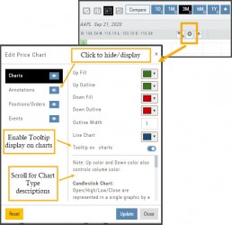 Global Chart Settings have always housed where to control candlestick/volume bar colors as well as Tooltip displays. Now, clicking on the gear allows you the ability to display Annotations, Positions/Orders and Events.